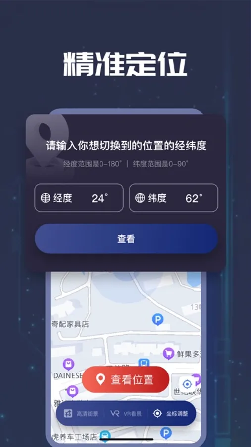 3D高清街景,足不出户即可欣赏美景;自定义经纬度,迅速切换坐标,查看当地街景。
