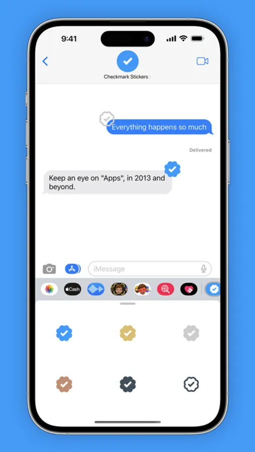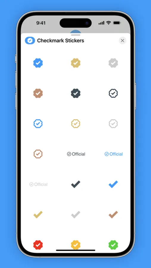 The great leveler is here. Impress your friends and frighten your enemies with twenty-two verified checkmark stickers — no subscription required!