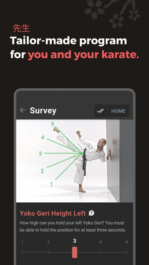 Sensei is the most advanced karate algorithm in the world. It tests your anatomy, strength and flexibility, asks about physical complaints and gets your body fit so that you can show your best karate. It regularly adapts your programme to your physical development. No matter if you want to regain old strength or if you are just starting your karate journey.