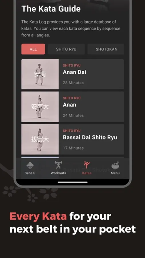 The Kata Log provides you with the largest database of kata. You can view each kata sequence by sequence from all angles. Whether Shito Ryu, Shotokan or Goju Ryu – the Dojo App provides you with the kata you want to learn now.