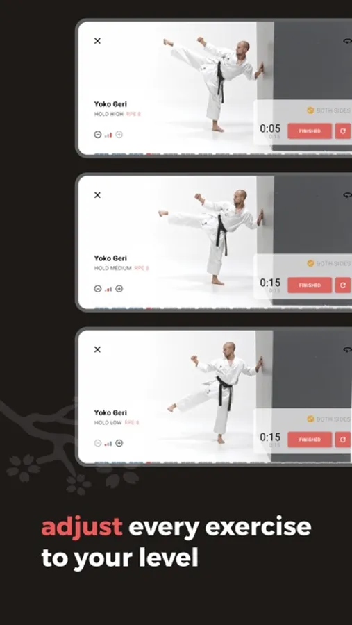 Dojo Workouts – the most advanced workouts in the world. You can customize each exercise within a workout to suit your ability. Each exercise consists of up to 6 levels that you can adjust during the workout. This way you can train together with your friends in your dojo without anyone being over- or underchallenged. Train regularly and see if you can advance to the next level of an exercise!