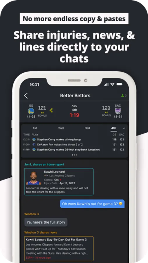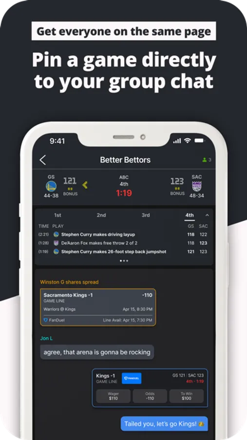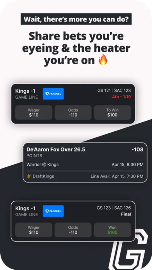 Easily access everything you want in one easy view, from pregame lines to post-game results. No more copy/pasting lines or screenshotting your action. With Goof, you can easily share all that stuff directly to your chat.