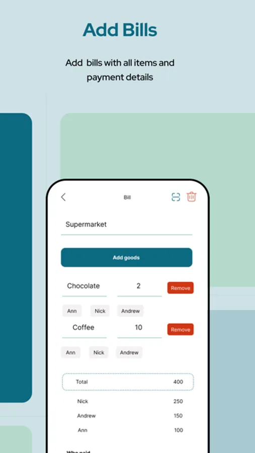 Once you start a bill creation, add all shared bill items and mark who are involved in each item of expenses and have paid that bill.