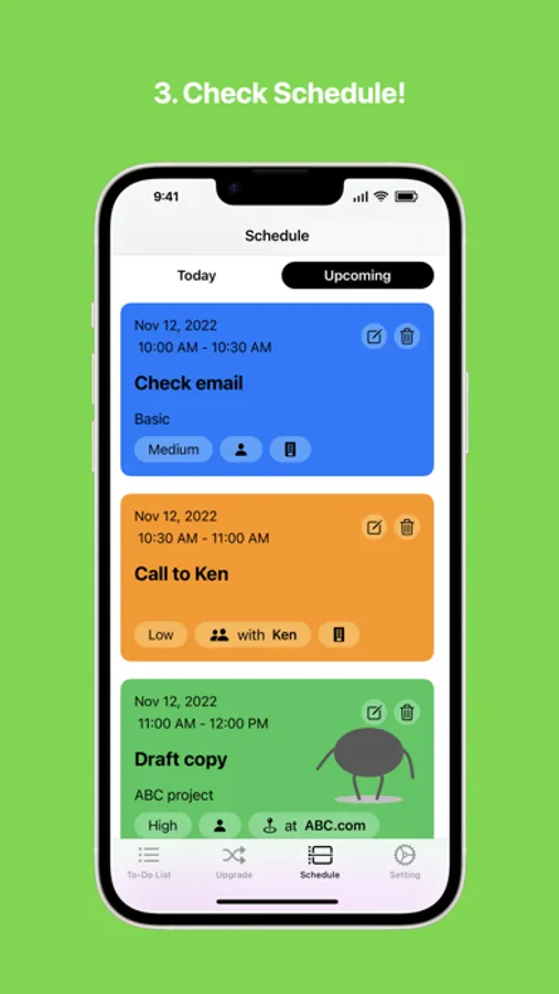 - Creating an upcoming schedule is necessary to organize and remind yourself of tasks. TanabotTodo makes it easy to convert your To-Do List into your Schedule.