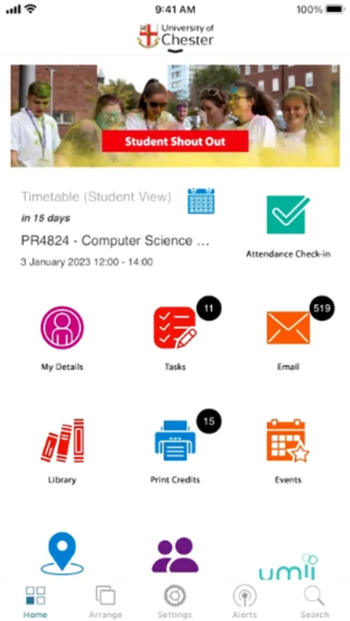 The University of Chester app shows your timetable, deadlines and alerts in one page. Check in for attendance.