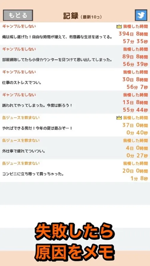 タイマーをリセットするときは、諦めた原因などを記録しよう。我慢できなかったトリガーを振り返る事で、次に繋げます。