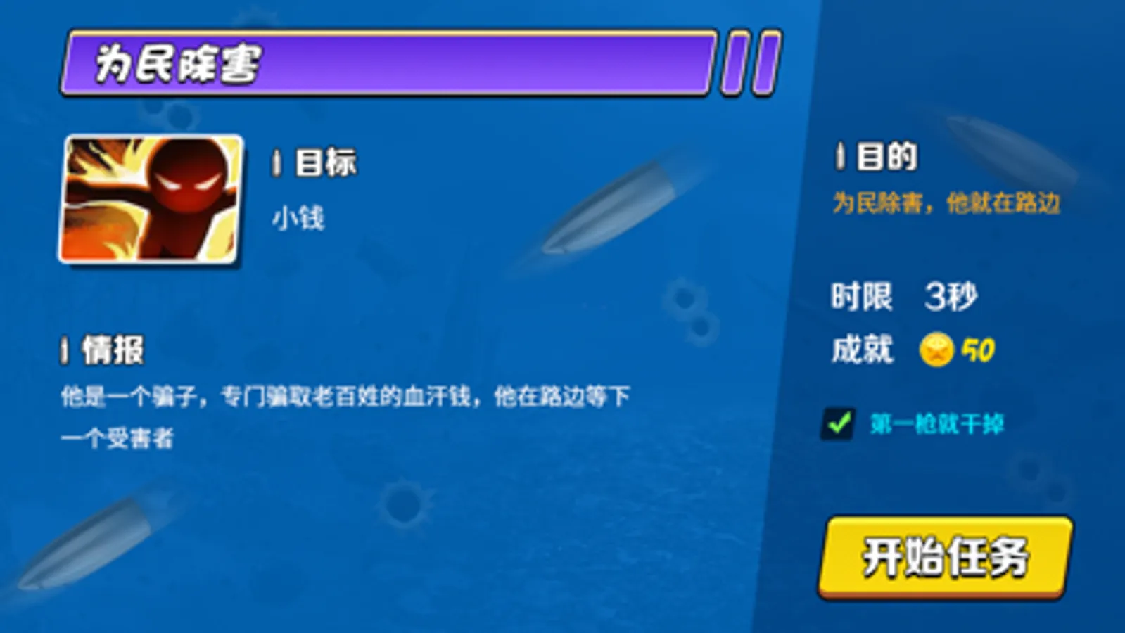 测试你的狙击技能来保护无辜的火柴人,瞄准、开枪杀死哪些坏人,犯罪分子,保护这座城市的稳定。