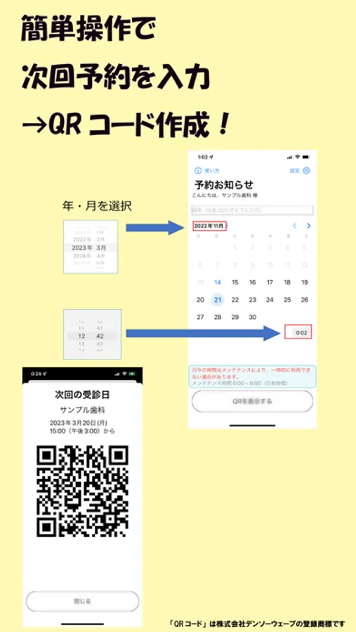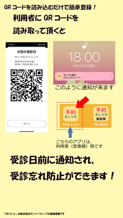 利用者様に「予約お知らせアプリ」をインストールして頂き、QRコードを読み取ることで利用者様に自動的に通知が送信されます。