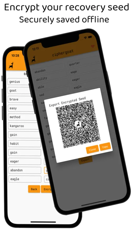 With ciphergoat, you can protect your recovery seed phrase and other sensitive information from loss or compromise with the most secure open source encryption standards. Run the app offline in a secure environment, encrypt your data with a strong passphrase, and export/import it as a secure QR code (SeQR).