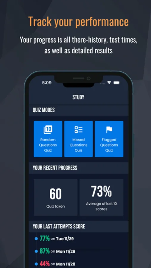 The app utilizes the “spacing effect” to enhance your learning capability. You’ll space out your studying into shorter, more productive study sessions which allow your brain to retain more information. Simply tell the app how many questions you want to take, enable the timer, and filter exam content to create the perfect study experience.