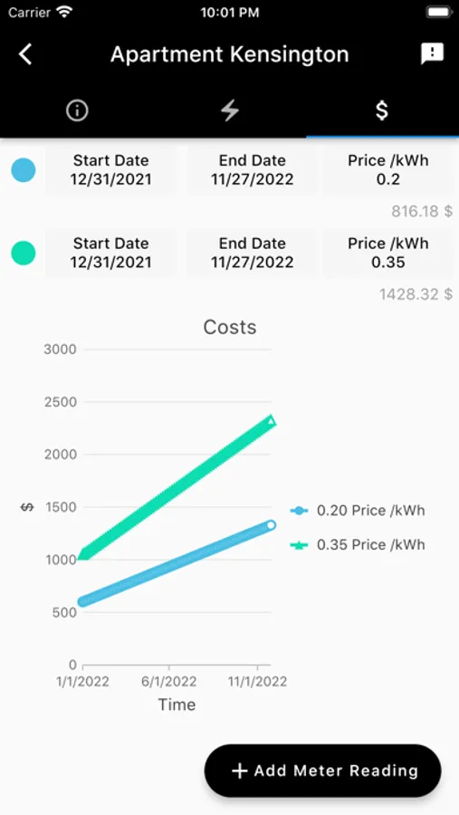 You can compare monthly consumption to other time periods. Other than that you can also simulate price changes in € or $ for certain periods with the app.