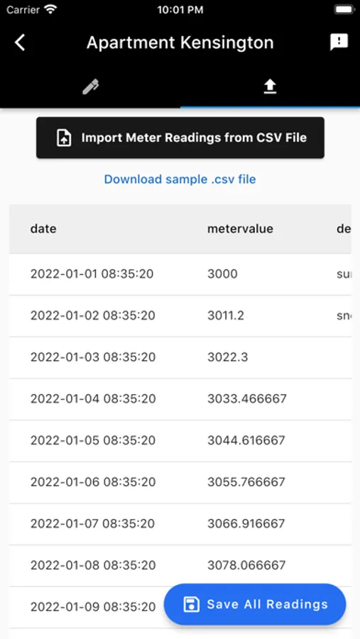You can add your electricity meter values either manually by typing or you can accelerate or automate this process by uploading a csv file.