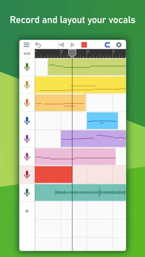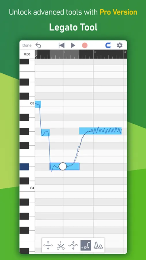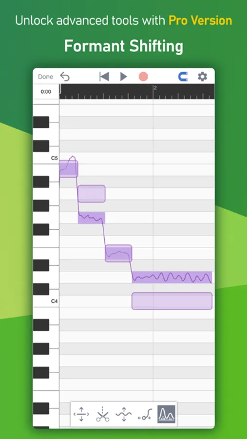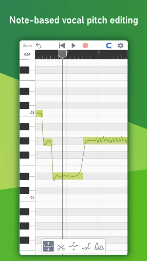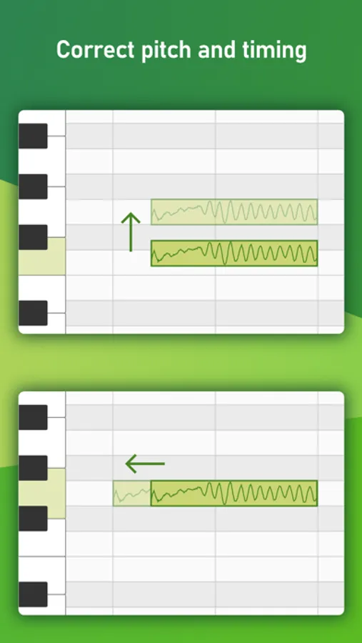 When recording vocals with MusicPutty, the app's algorithm analyzes the pitch information of your vocal takes and gives you the ability to edit them note by note. You can use it to correct pitch and timing issues or even change the original melody completely! You can also use the app's copy/paste feature to create complex harmonies with ease.