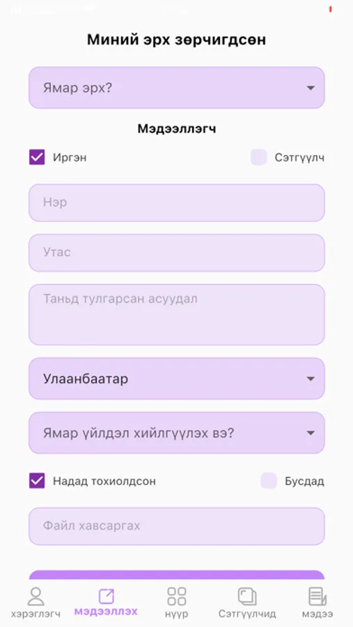“МИНИЙ ЭРХ” гар утасны апп нь дараах боломжийг агуулсан Иргэн, сэтгүүлч өөрийн мэдэх эрх хаана хэнд хэрхэн зөрчигдсөнийг мэдээлэх, “Глоб Интернэшнл Төв”-с гаргаж буй контент үзэх, сэтгүүлчид хоорондоо мэдээлэл, санал солилцох боломжуудыг бий болголоо.