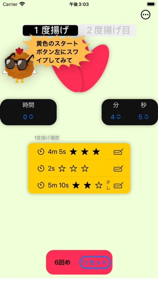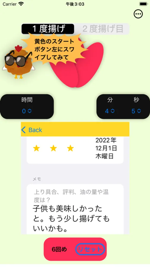 カウントダウンが終了した時点で履歴に残るので、揚がり時間の調整、試行錯誤にご利用頂けます。