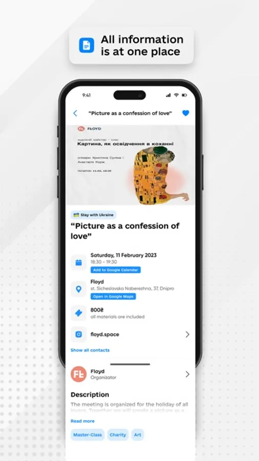 Start your journey to easier leisure searching today! You can now forget about numerous services for finding interesting events in your city because everything fits into one convenient app.
