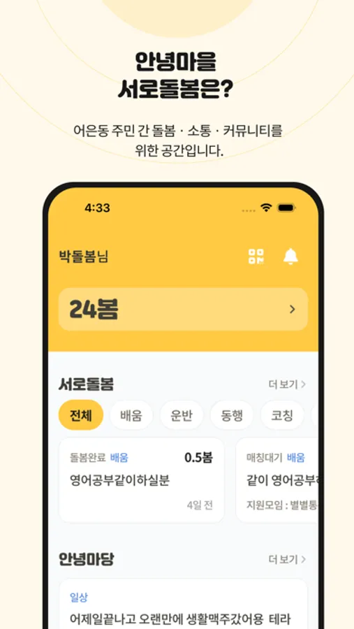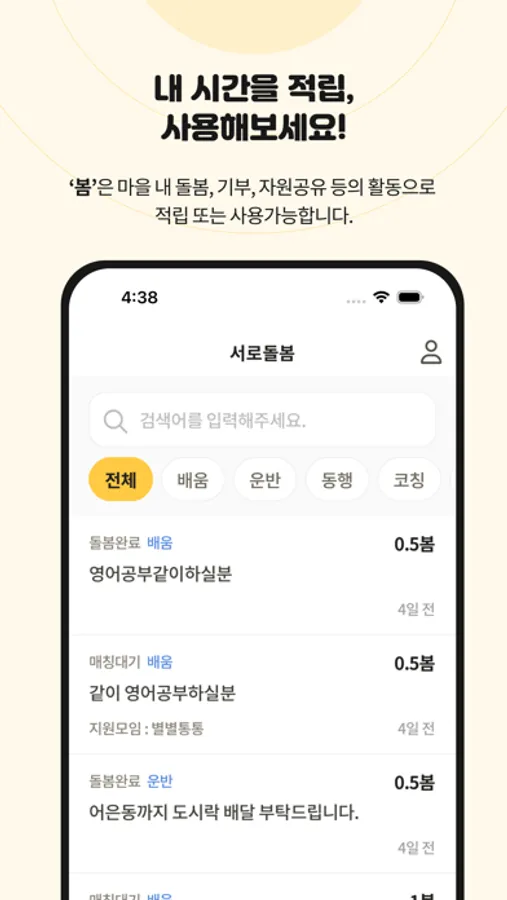 ‘봄’은 마을 내 돌봄, 자원공유 등의 활동으로 적립 또는 사용가능합니다.