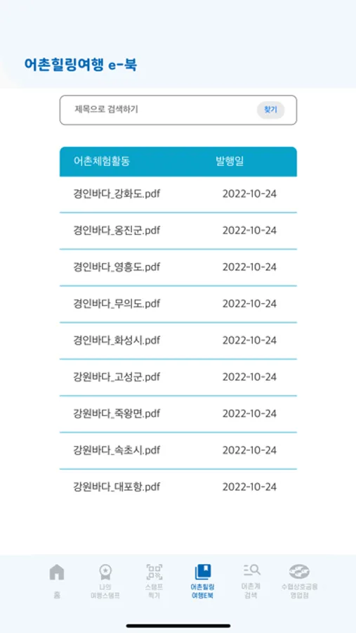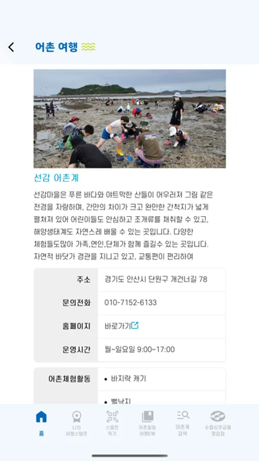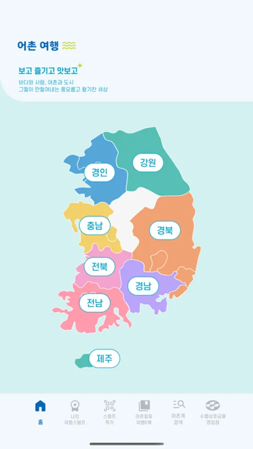 국내 어촌 곳곳의 맛집, 관광지 검색, 수협 중앙회 검색 등을 할 수 있습니다. 어촌계 방문 후 스탬프를 모아서 여행을 기록해보세요. 지역별 어촌 체험마을과 체험마을 정보를 확인할 수 있습니다.
