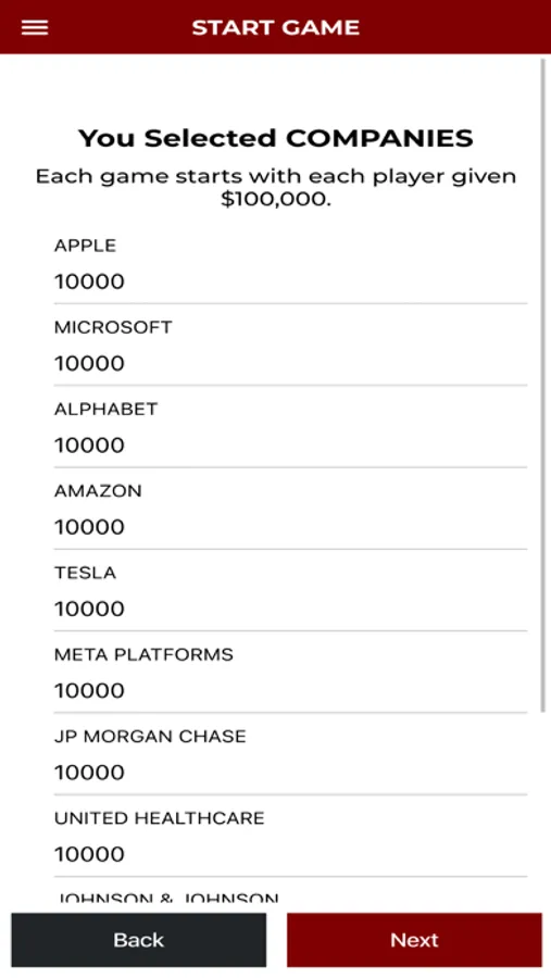 Each player allocates the $100,000 across eleven (11) sectors of the economy or companies – as decided by the player who starts the game. This is called asset allocation.