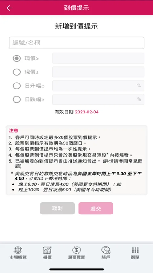 Prompt notification will be sent once the price you preset for a stock in Price Alert function is triggered