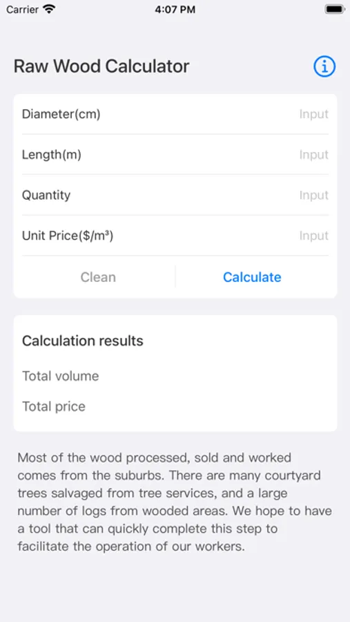 When selling wood, timber workers can quickly calculate the price of wood according to this application, calculate the volume according to the length and perimeter of wood, and quickly calculate the overall price of wood according to the price of each cubic meter of wood.