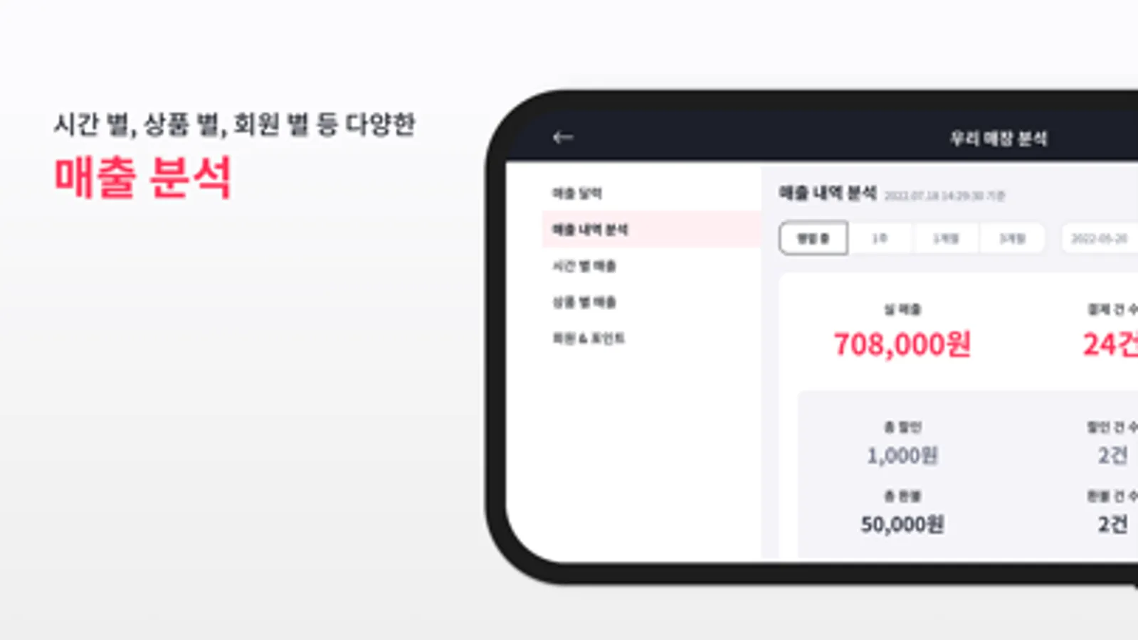 ▷ 시간 별, 상품 별, 회원별 매출 분석과 매출 리포트 제공하여 똑똑하게 비즈니스 운영을 할 수 있습니다.