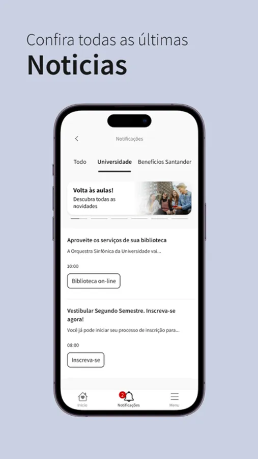 2. Em breve, você terá acesso a serviços acadêmicos móveis personalizados, tais como: notas, matérias, calendário de aulas, eventos, boletos e muito mais.