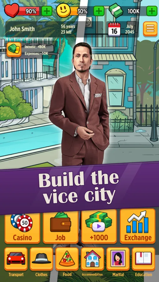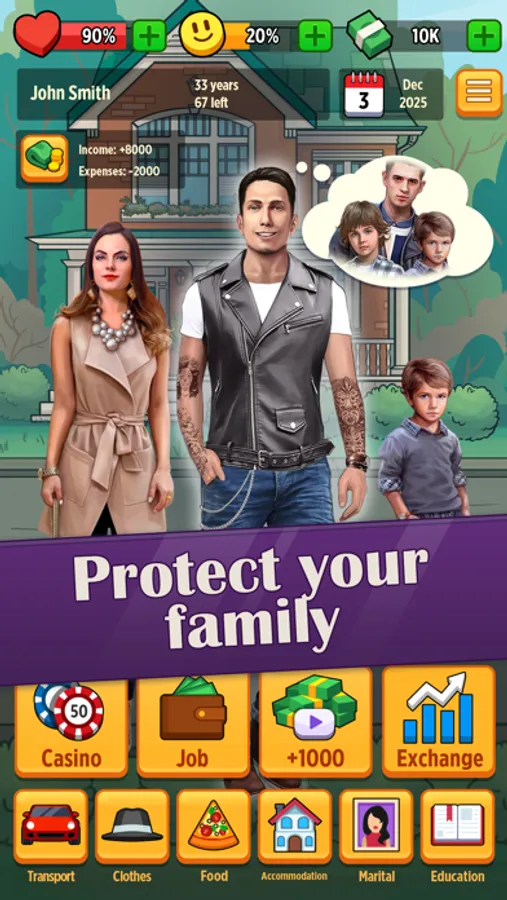 CONTROL your health. It’s a life simulator after all - check your health and happiness bars and look after your health every day: don’t forget to take your pills and do workout to survive until you achieve all your goals. It would be a waste to die from hunger or spoiled sood, wouldn’t it?