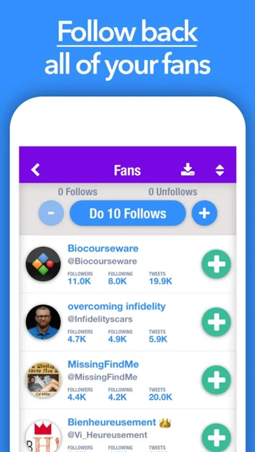 Let the app find out who is not following back, your fans, your new followers, your lost followers...
