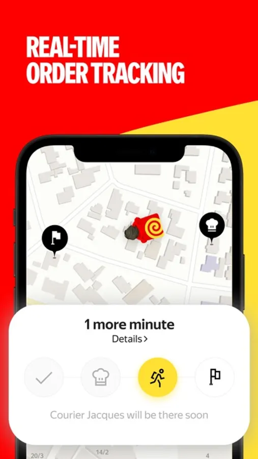 Enter the delivery address — we will find the nearest store or restaurant to you and deliver the order as quickly as possible. On average food is delivered in 32 minutes after placing an order — even faster than you would get ready to go shopping.