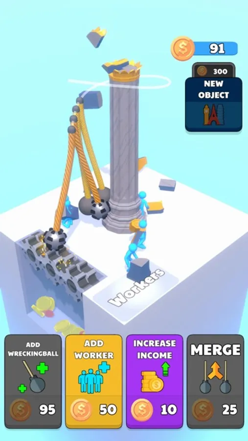 Upgrade your wrecking balls to break the objects to pieces.