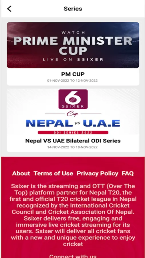 Ssixer is the streaming and OTT (Over The Top) platform partner for Nepal T20, the first and official T20 cricket league in Nepal recognized by the International Cricket Council and Cricket Association Of Nepal.
