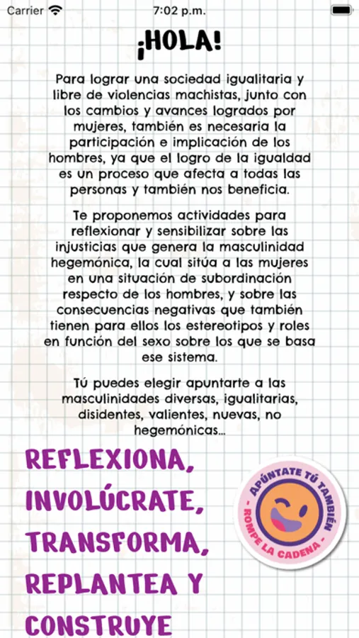 Esta herramienta lúdica educativa pone a disposición diferentes ejercicios, actividades y recursos interactivos que contribuyen a generar reflexión y cuestionamiento sobre la construcción y de-construcción de la masculinidad hegemónica y su impacto para promover una sociedad más igualitaria y libre de discriminación.