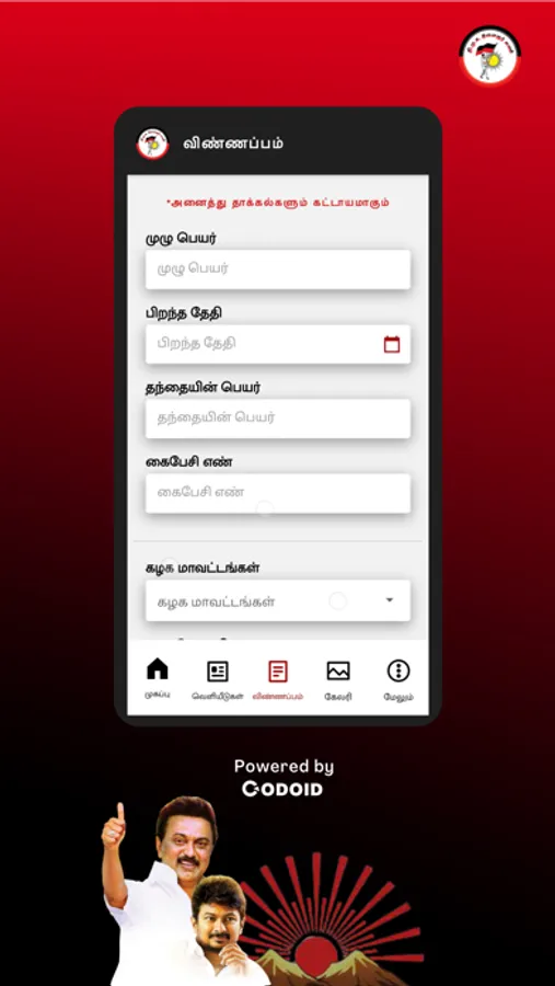 DMK Youth Wing App is a first of its kind digital application designed to facilitate two-way communication between the Youth Wing and its members.