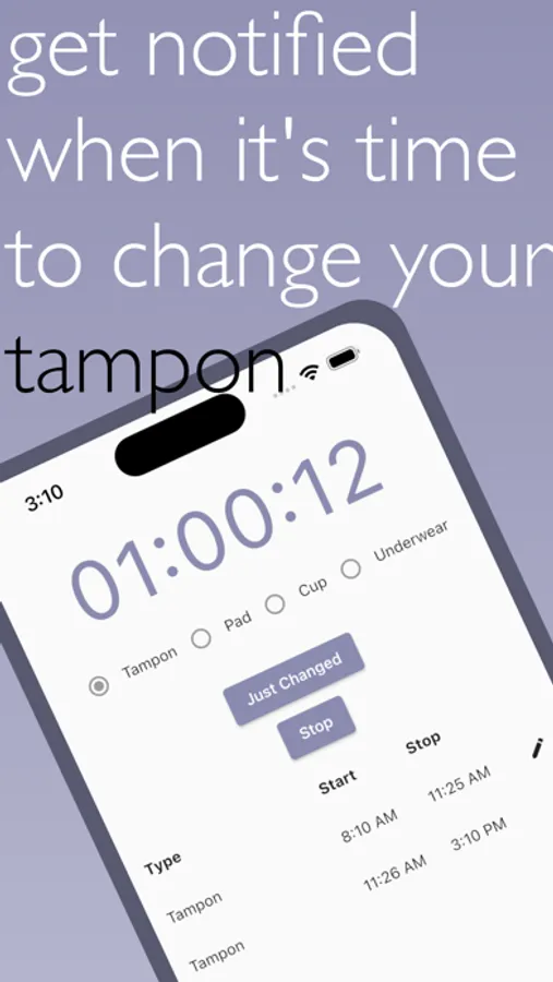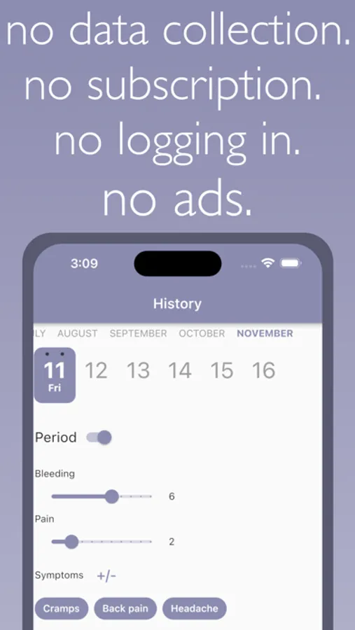 Tyd lets you track your period while keeping your data private. Tyd will never collect or sell your data, require you to log in, show you ads, or sell you a subscription. Plus, it has unique features, like a timer that notifies you when it's time to change your tampon and algorithms that display all kinds of cool statistics about your period.