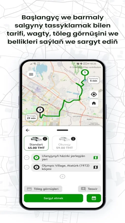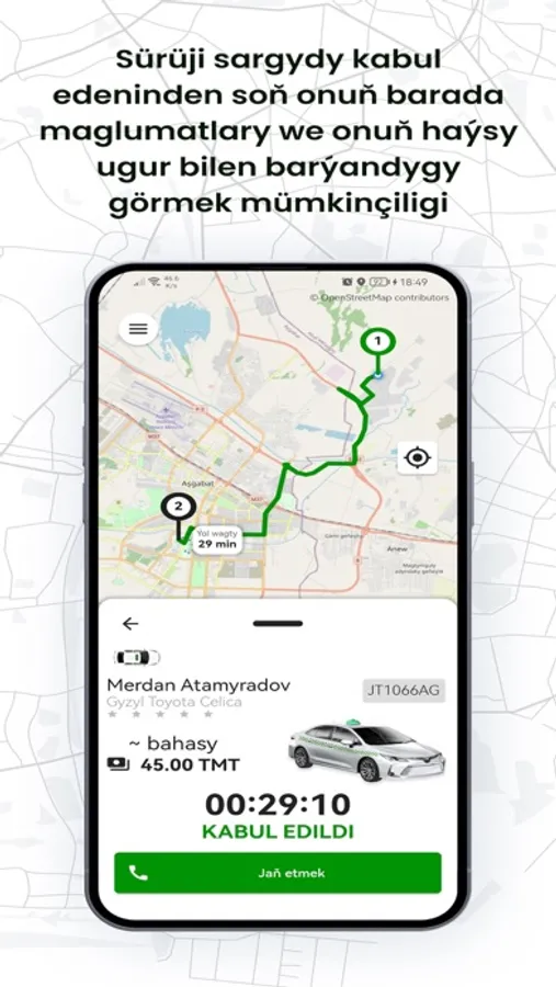 Günüň islendik wagtynda taksi hyzmaty onlaýn sargyt üçin mümkinçiliginden peýdalanyň. Onlaýn taksi goşundysynyň kömegi bilen siz bir ýerden beýleki ýere gysga wagtda baryp bilersiňiz.