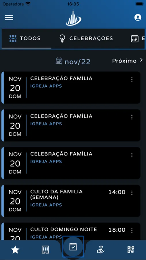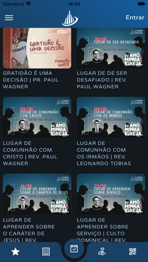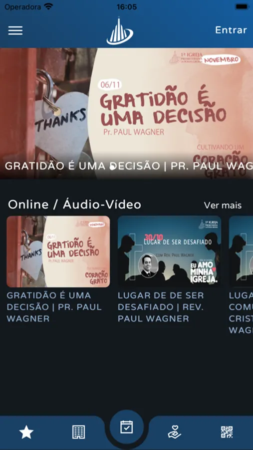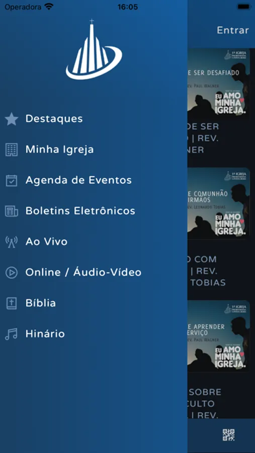 * Conteúdos (Áudio/Vídeo): Permite visualizar e ouvir os conteúdos da Igreja disponíveis no App;
