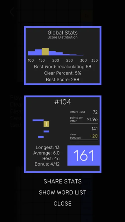 Every day you'll get a board of 25 letters. Your goal? Make the best words you can to get the highest score you can! Be careful though, each letter can only be used 3 times. Ok fine, you can use the center letter as much as you want.