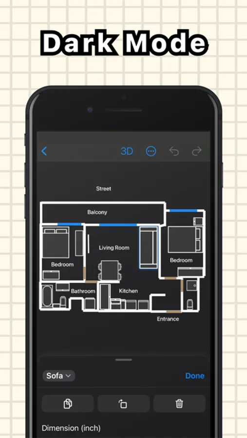 • 2D: Customize a sleek 2D plan with movable, rotatable furniture pieces.