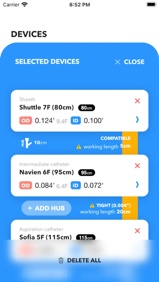 Calculate compatibility between devices by adding them to the compatibility sheet. Compatibility is calculated considering the length, outer diameter, and hemostatic valve size.