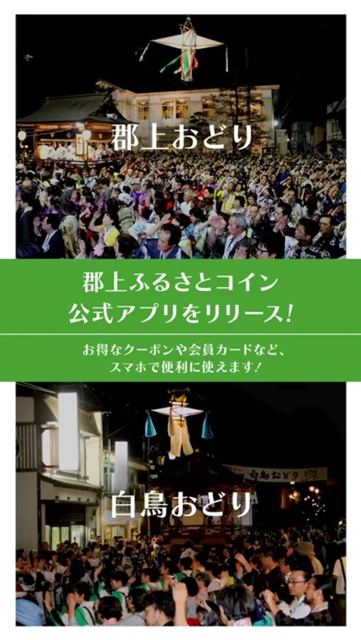 本アプリでは郡上市からのイベント情報や郡上ふるさとコインに関わるお知らせなどを定期的に配信いたします。