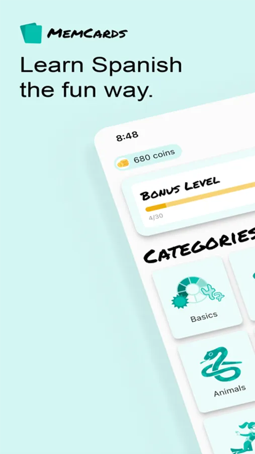 Each card has either an English word, or a Spanish word. The goal is to match the English word with the Spanish translation. Once you match all the cards, you could win coins and bonuses!