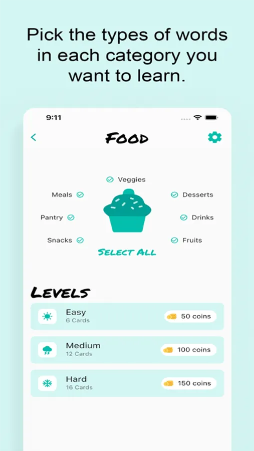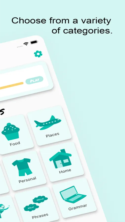 You can pick and choose which kind of words you would like to focus on learning. There are a huge variety of categories and types of words to choose from, including colors, numbers, animals, food, verbs, grammar, common phrases and more! With over 2000+ words, you will never run out of new words to learn!