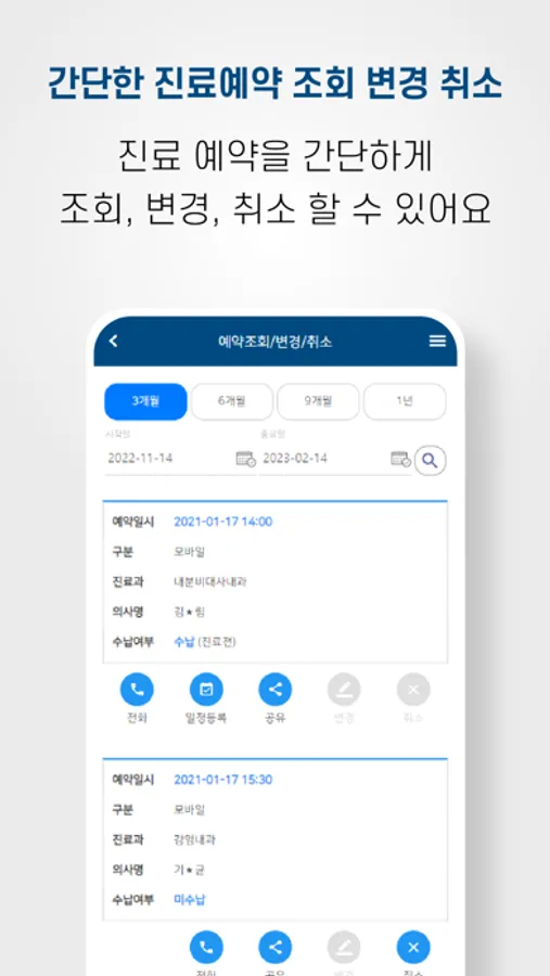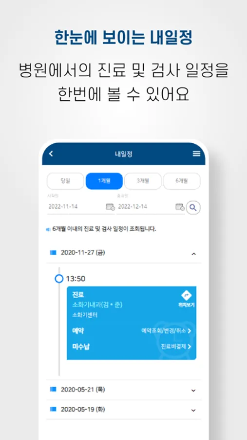 병원에서의 진료일정을 한번에 보실 수 있습니다.