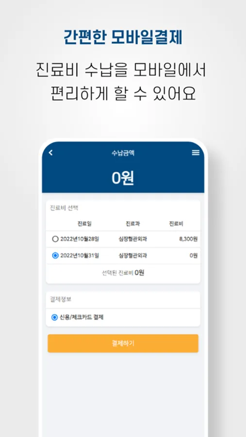 진료비 수납을 모바일에서 편리하게 결제 할 수 있습니다.
