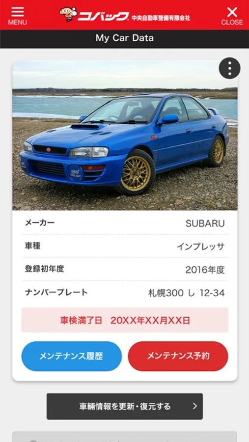 一度店舗へご来店いただきお車の登録がある場合、アプリに必要情報を入力していただくと、ご自身のお車の車検時期などがアプリ上でご確認いただけます!
