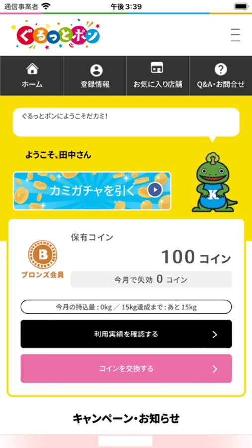 コインは会員ランクに応じて貯まり方が変わります。毎月15kg以上の資源物を継続的に持ち込むとランクアップし、プラチナ会員になると同じ持込量でも獲得コインは6倍に!