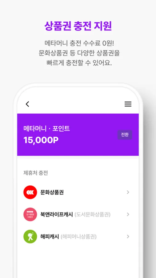 메타클럽에서 쉽고 빠르게, 수수료 없이! 메타머니로 충전할 수 있어요.