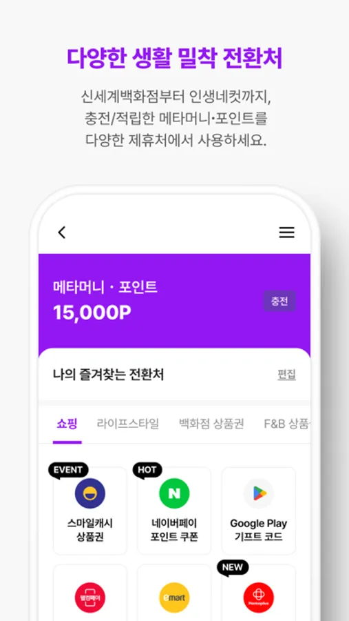 메타머니・포인트를 라이프스타일에 맞춘 다양한 전환처에서 현금처럼 전환해서 사용해보세요.