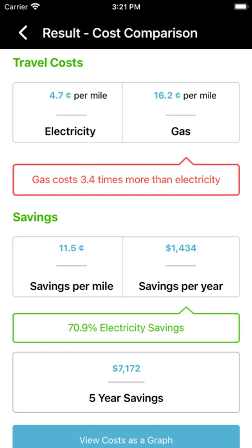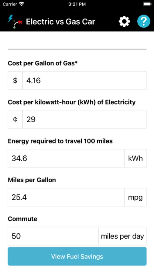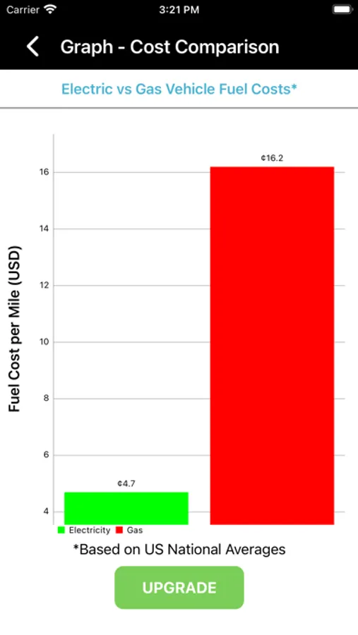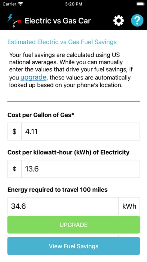 In the FREE version, we calculate your fuel savings based on US national averages for the cost of gas, electricity, tmiles per gallon and your estimated commute. Depending on where you live and what kind of car you drive, your fuel savings will be less or more. Upgrading will use the location of your phone to get local prices and you'll be able to enter the year, make and model your current car as well as your commute. While these values are determined automatically, they can also be changed if desired.
